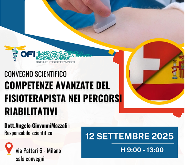 Convegno scientifico: Competenze avanzate del fisioterapista nei percorsi riabilitativi 12 SETTEMBRE 2025 9:00 - 13:00 presso via Pattari 6 - Milano sala convegni Locandina convegno